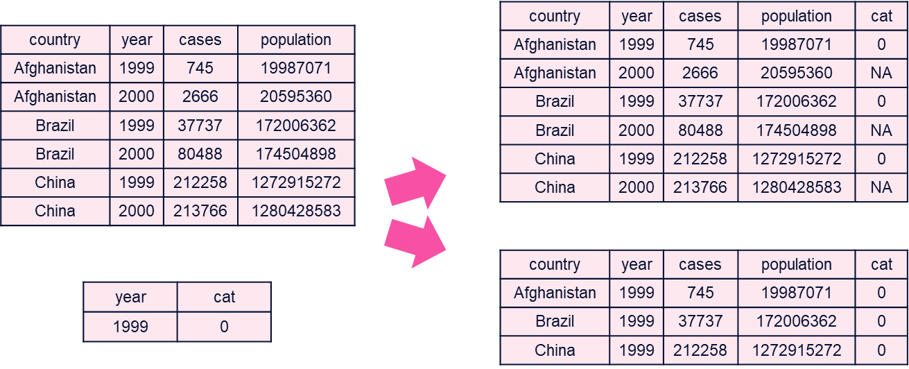 E se as linhas não forem as mesmas? Precisamos de um merge/join: inner_join(), left_join(), right_join(), full_join().
